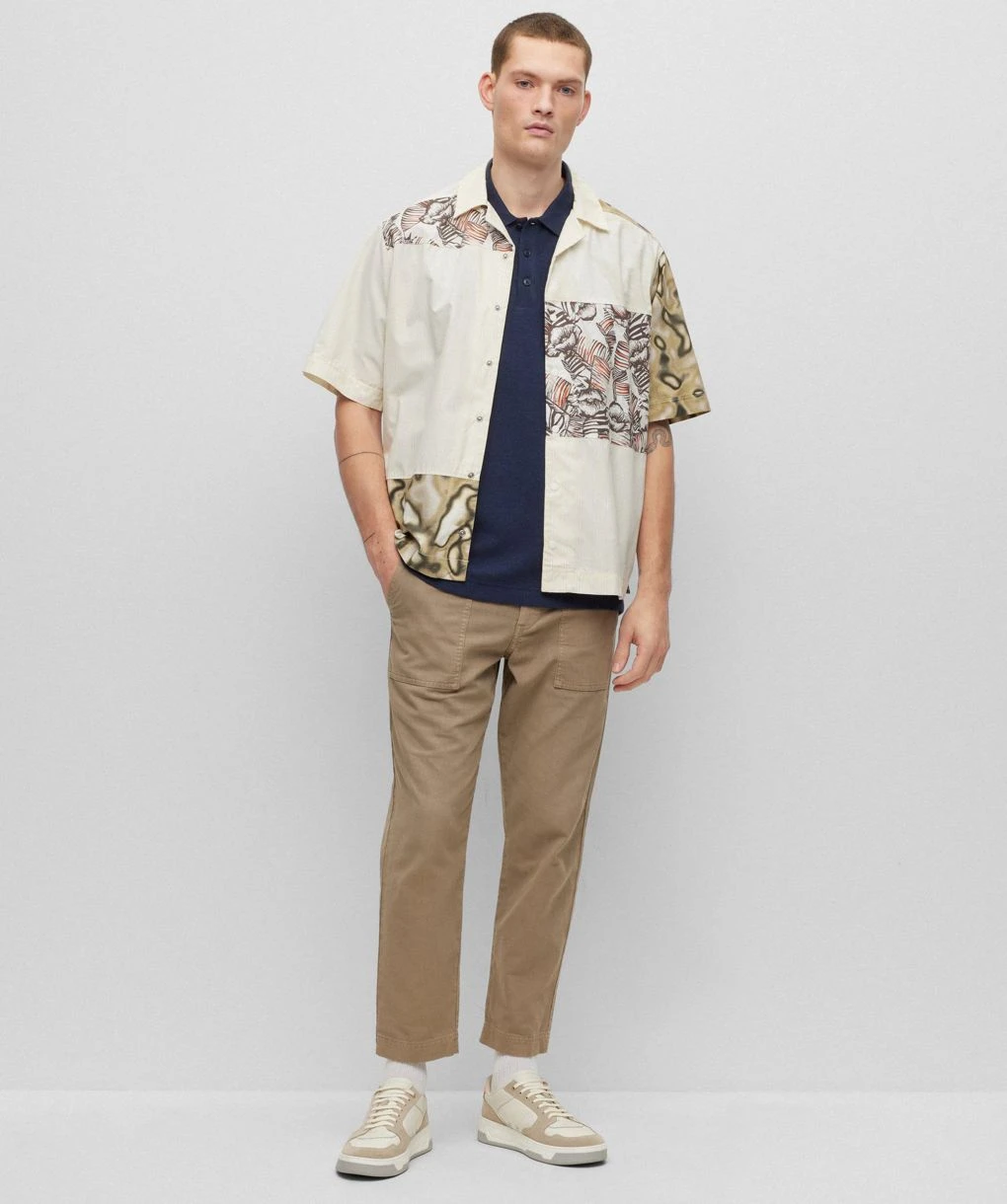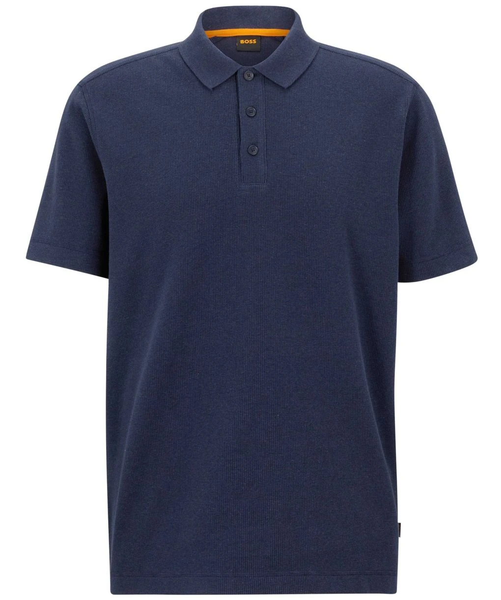Upgrade your leisurewear with the BOSS Petempesto polo shirt. Cut to a relaxed fit, the polo has been crafted in a stretch blend with a waffle structure. Featuring a flat knit collar with three button placket and short sleeves, whilst purchasing this item contributes to the Cotton Made In Africa initiative that was set up to aid farmers’ working conditions.