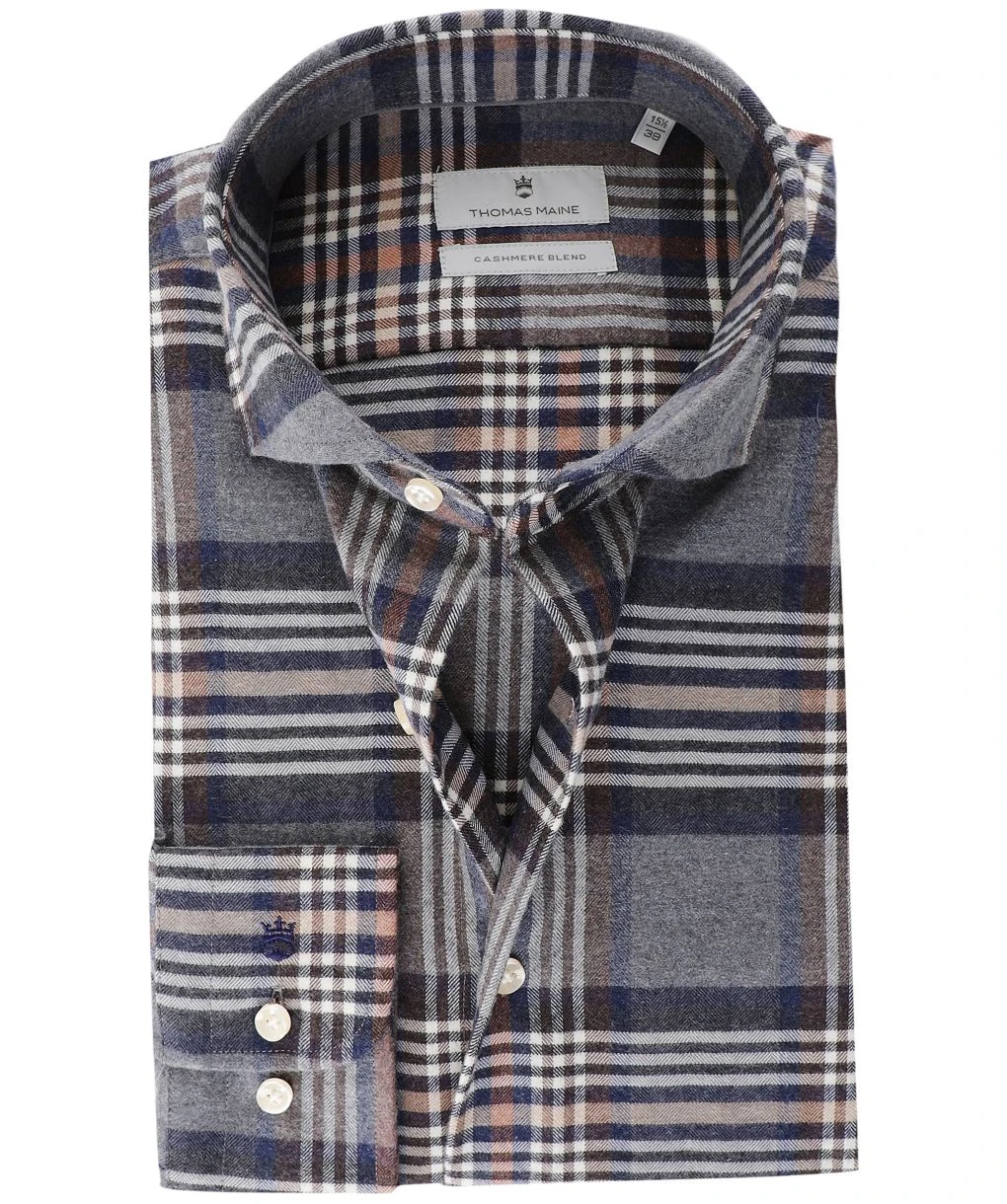 Elevate your winter shirting with the Thomas Maine check shirt. Cut to a tailored fit and crafted in a flannel cotton with a touch of cashmere, the shirt promises unbeatable softness and comfort. Featuring a cut away collar, French placket and adjustable cuffs, whilst the check pattern lends country charm.