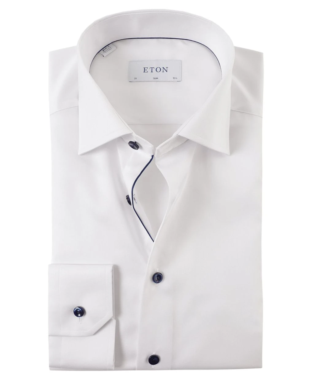 Essential and charming, the Eton slim fit twill shirt is sure to effortlessly complement both your on and off-duty attires. Exquisitely crafted from the iconic medium weight twill fabric, the refined shirt is detailed with contrasting piping and matching buttons that add subtle dimension and a superior luxury feel. Complete with traditional shirting features such as a cut away collar and angled cuffs, wear under your go-to tailoring or tuck into jeans depending on the occasion.