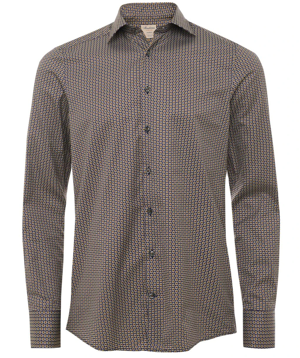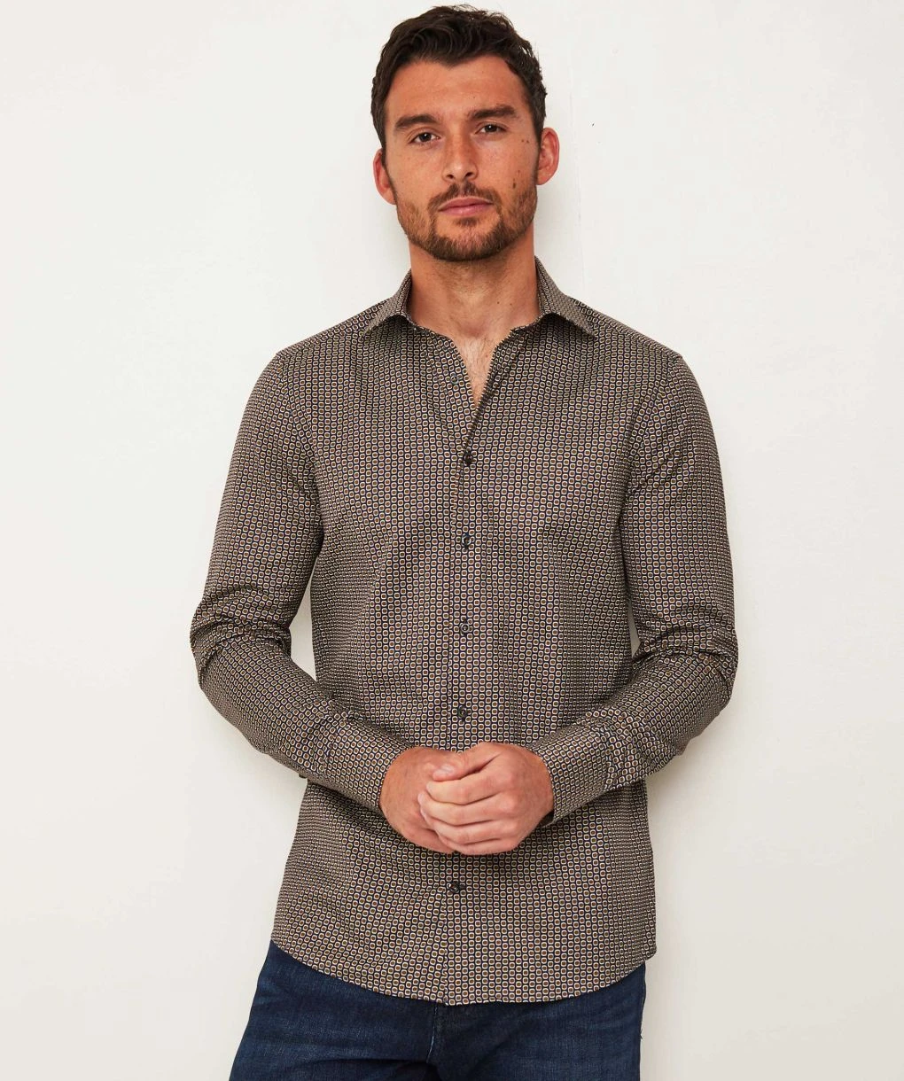 Sharpen up your smart-casuals with the Stenstroms geo pattern shirt. Expertly constructed in premium twofold super cotton and cut to a flattering slimline silhouette, the refined shirt is adorned in a playful repeat pattern for a charming aesthetic. Complete with a cut away collar and neat French placket, whilst the mother-of-pearl buttons add a luxe finish.